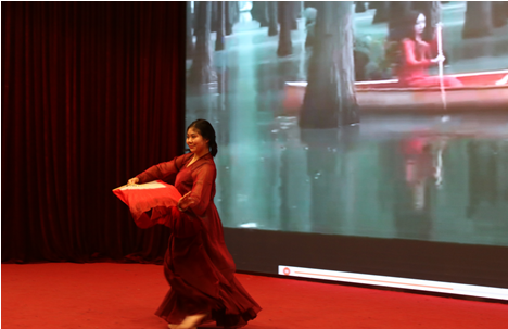 舞蹈《万疆》(负责人:刘雨桐):将国风旋律与传统意蕴深度融合,舞者舒展的肢体动作融入太极般的沉稳气韵,既彰显了中医药文化的厚重底蕴,又勾勒出中华大地的辽阔意境。每一个眼神流转、每一次转身回眸都韵味悠长,台下观众静静观赏,舞蹈收尾时掌声轰然响起,满含对传统文化与舞台艺术创新融合的赞叹。